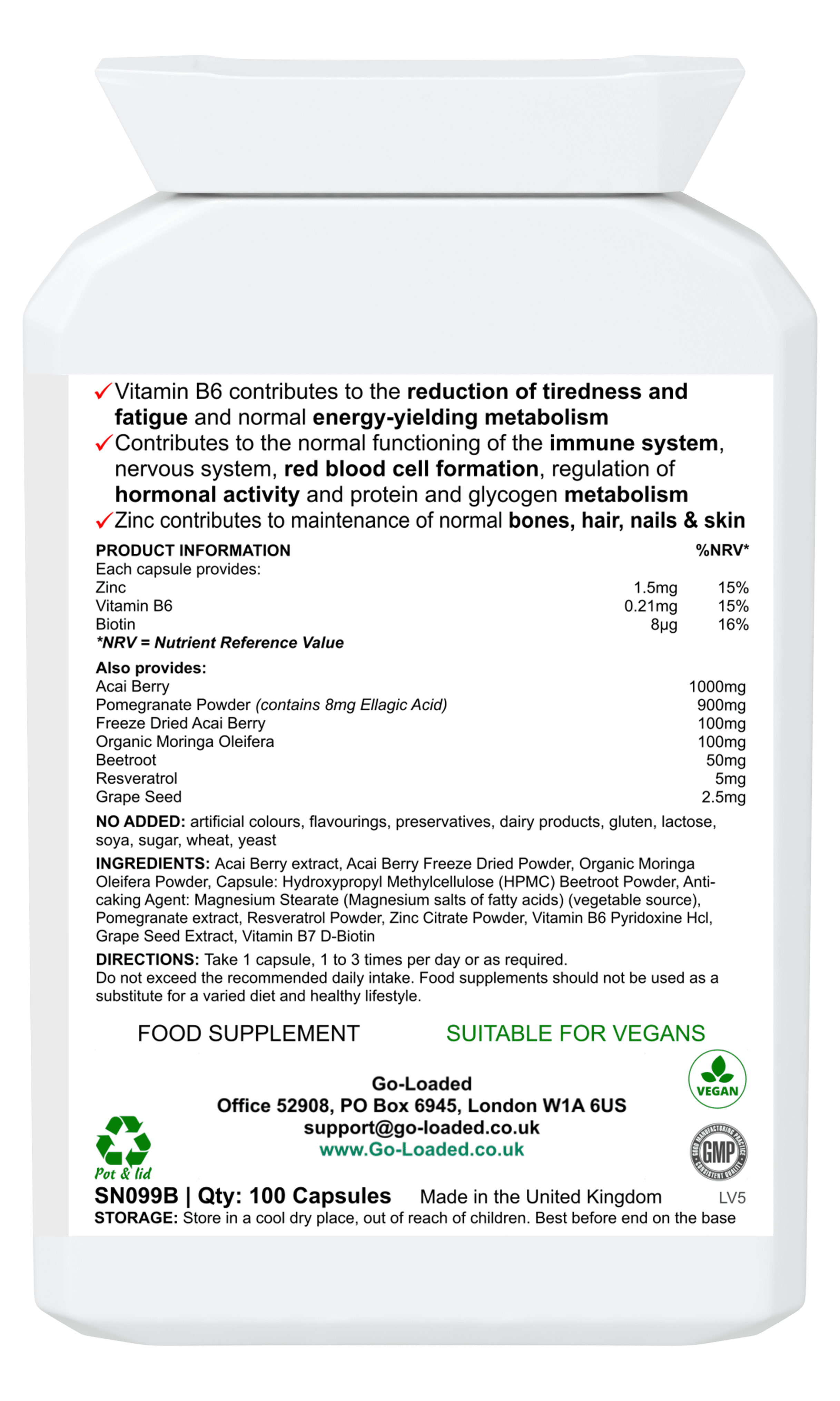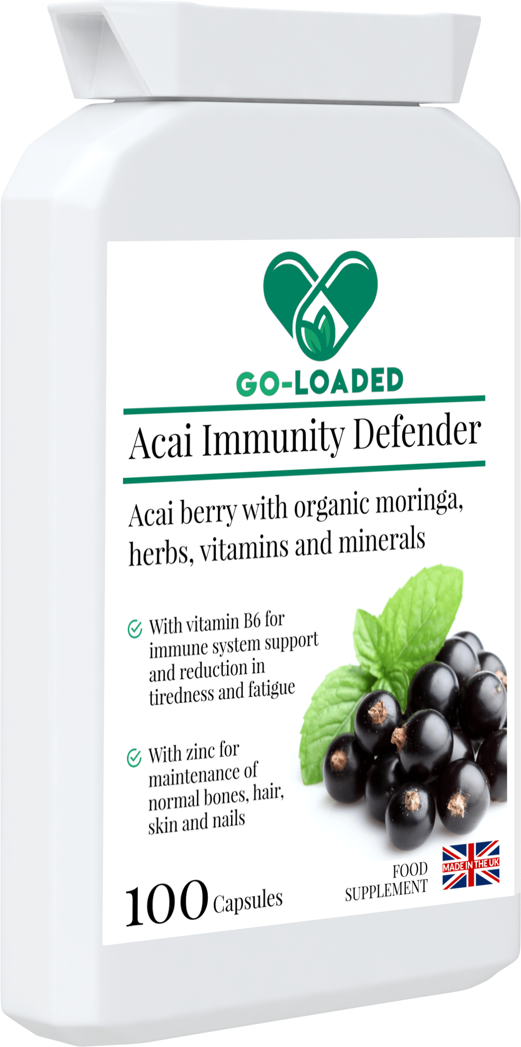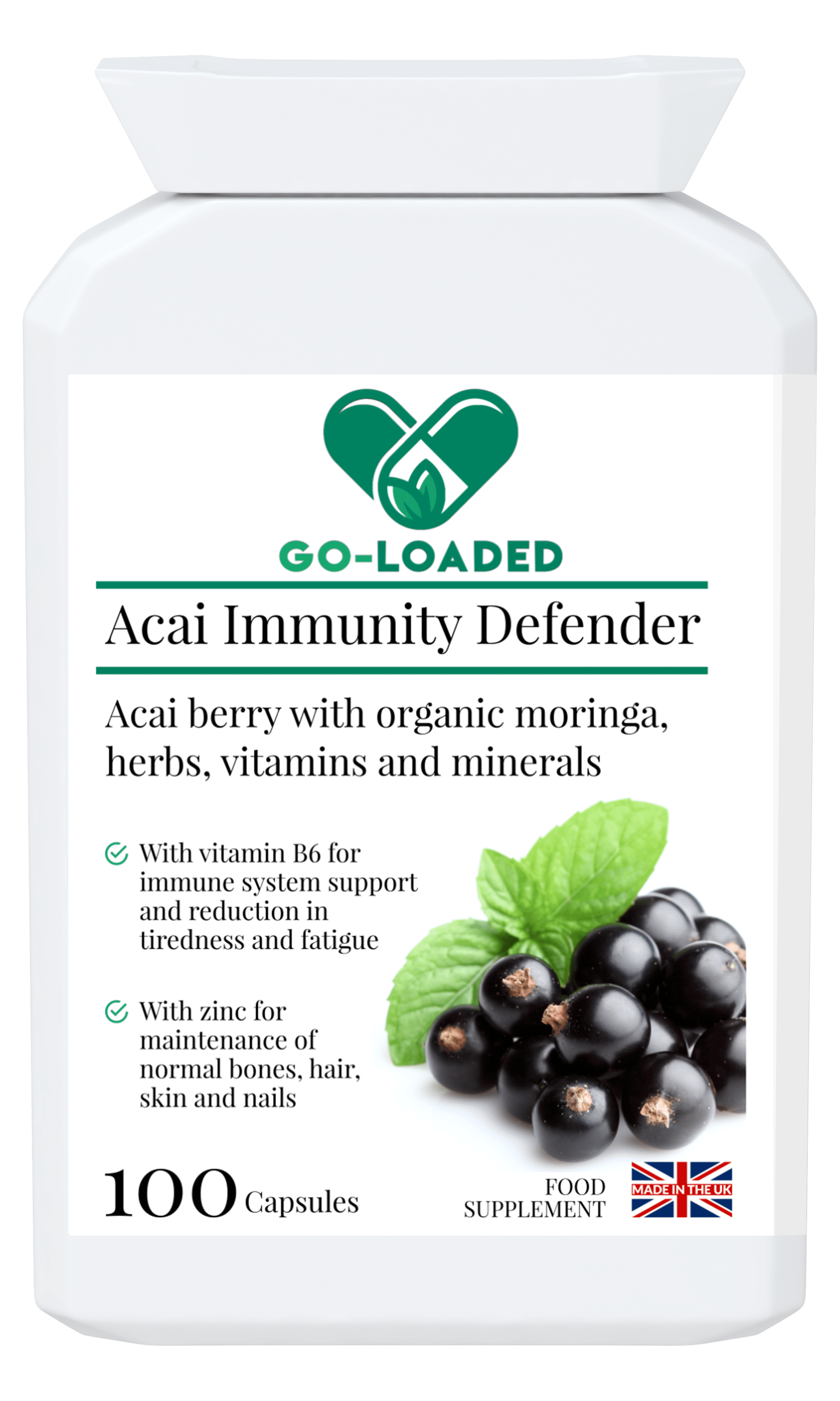 A high-potency formulation, which combines Brazilian freeze-dried acai berry powder and extract with a range of other beneficial ingredients, including vitamins, minerals and herbs (such as zinc, vitamin B6, biotin, organic Moringa Oleifera, beetroot and more) to provide support for immunity, energy, bones, hair, skin, nails and more.